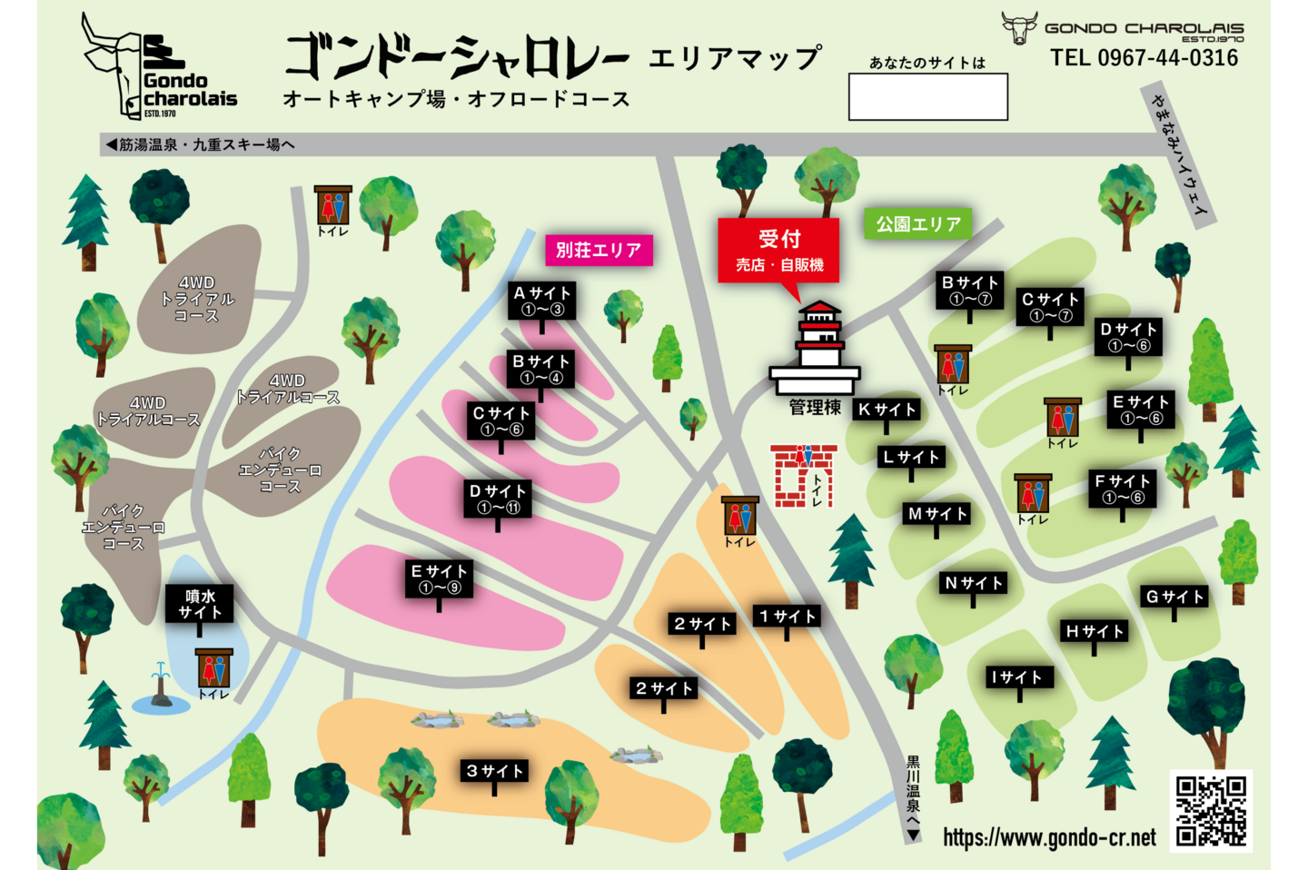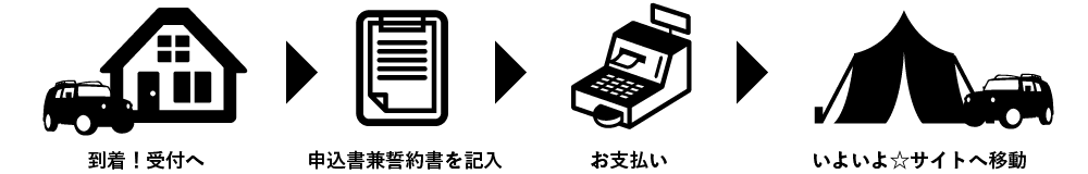到着されましたら、まず管理棟で受付をして、お支払いを済ませて下さい。エリアサイトをお伝えしますので、各自お車で移動してください。(注:場内10キロ徐行です🐢)